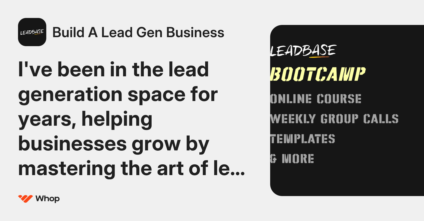 I've been in the lead generation space for years, helping businesses grow by mastering the art of lead gen. Now, I'm thrilled to offer my expertise through the Leadbase Bootcamp. Join our community to receive hands-on feedback and access valuable resources. Let's boost your lead gen skills together!
